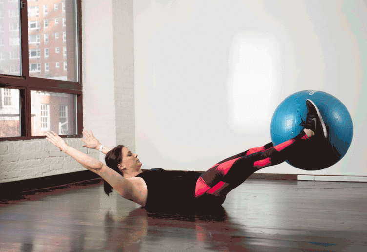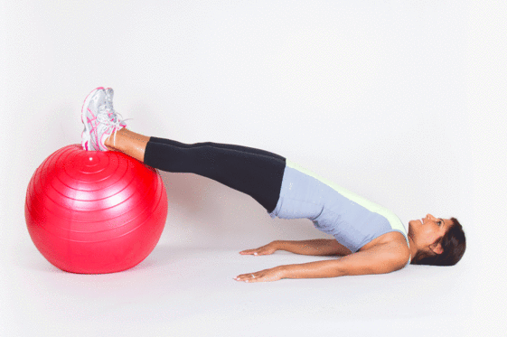 - Feküdj le a földre, a kezeidet pedig helyezd a tested mellé és tedd mindkét lábad a gimnasztikai labdára, úgy ahogy azt a képen is látod.