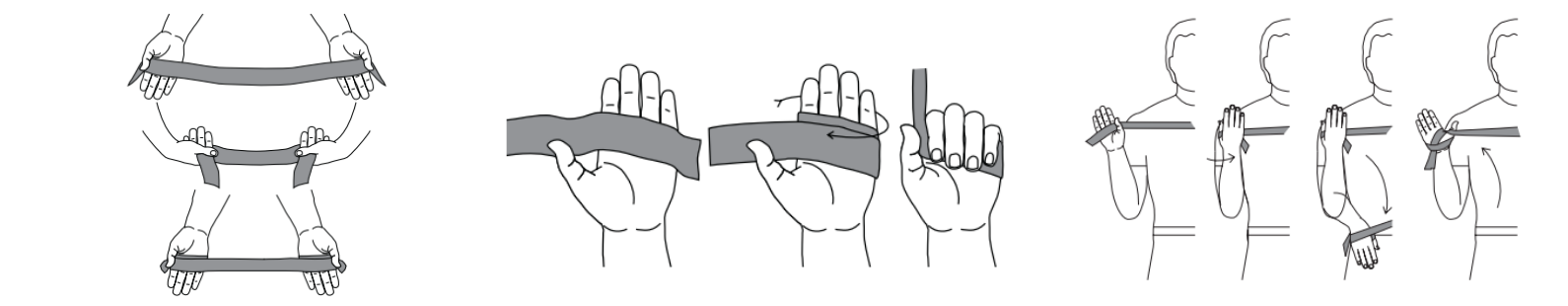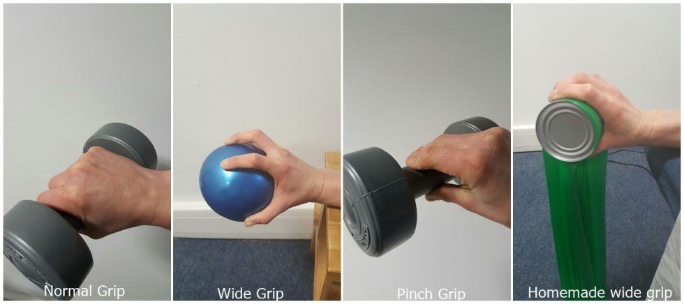 Az alábbi ábrán láthatjuk a hengerfogást, – súlyzó, a labdafogást, a precíziós fogást- ami nagyon megterhelő a kéznek- és a szalaggal kivitelezett hengerfogást, így téve ízületbaráttá a sima szalaggal végzett gyakorlatot. Ennél kifinomultabb a fogantyú alkalmazása, és annak érdekében, hogy a szalagot fel tudjuk rögzíteni a magasba, és ne sérüljön a lehúzásos gyakorlatok közben érdemes egy rögzítőhurkot vagy ajtórögzítőt is beszerezni.