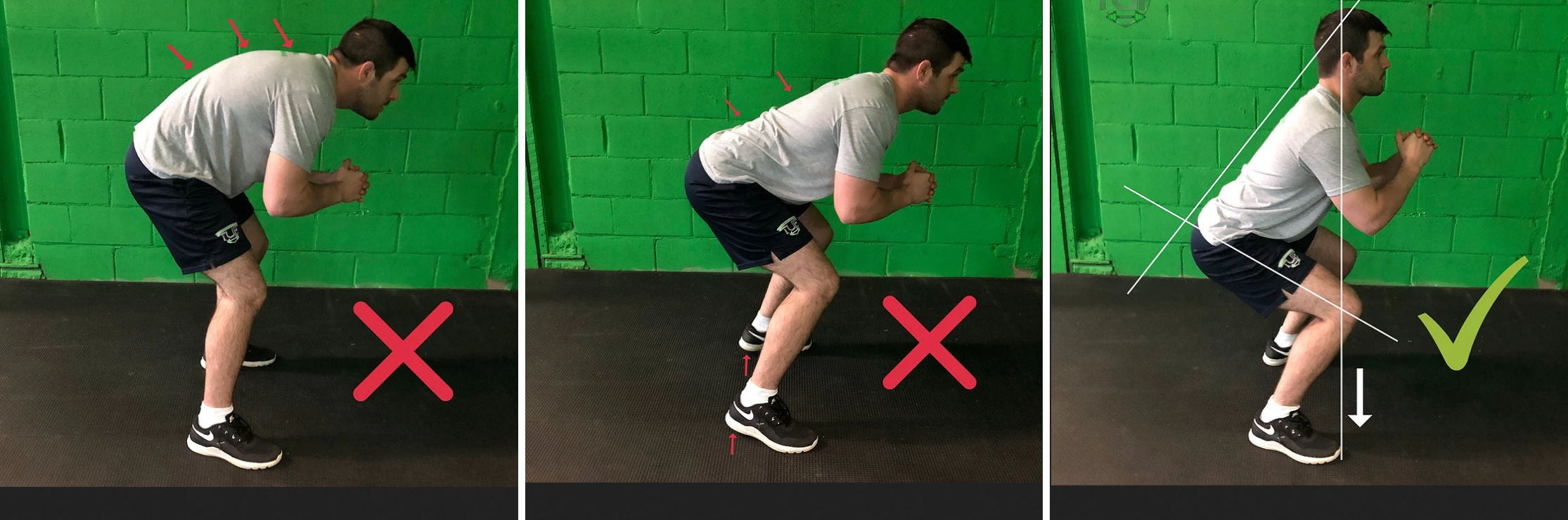 Az alábbi képen látható, az elülső és a hátsó izomlánc gyengesége, a boka mobilitás hiánya, hiszen nem ér le a középső képen az sportoló sarka. Az utolsó ábrán láthatjuk, hogy a jól kivitelezett guggolás esetében, a térd nem előzi meg a nagylábujj vonalát, a lábfej irányába tart, a fülek és a térdek egy vonalba esnek, a súlyvonal az alátámasztási felület felett marad. Hogy könnyebb legyen ezt gyakorolni, érdemes egy rudat a hátunk mögé helyezni, és ezzel tudatosítani a megfelelő tartás. Ez esetben a farokcsontnak, a háti szakasz lapockák közötti részének (nőknél a melltartó pánt magasságában) (Th7-8) és a fej hátsó részének egyszerre kell érintkeznie a bottal egyenes állás és guggolás közben is egyaránt. Ehhez, egy Gymstic bot is a segítségünkre lehet, amit aztán ha már jól begyakoroltunk az alap mozdulatot tovább nehezíthetjük az eszköz elasztikus ellenállása által.