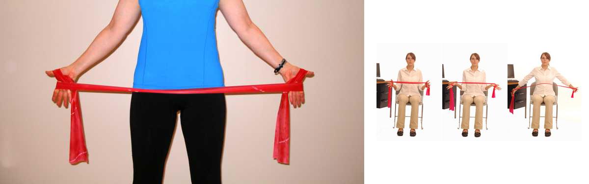 Kezdő pozíció: Ülő helyzetben helyezkedjünk el, kezünket emeljük tenyérrel előre és hurkoljuk a szalagot a hüvelykujjunk és a csuklónk köré, kb. 60 cm-es szalagrészt hagyjunk a két kezünk közt, és hajlítsuk be a két könyökünket.