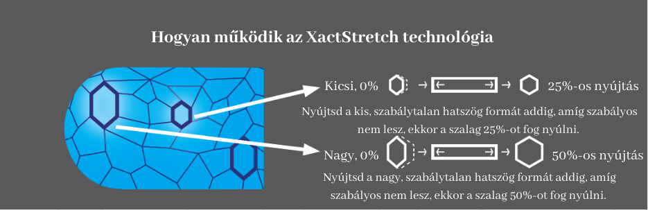 Az XactStretch™ technológia egy speciális mintázattal ellátott, új, vizuális felhelyezési útmutató, mely segíti a pontos felhelyezést. Ennek köszönhetően a TheraBand kineziológiai tapaszait te magad is fel tudod helyezni a kívánt területre. A TheraBand kineziológiai tapaszon elhelyezett hatszög formák segítségével egyszerűen követhető a tape százalékos nyúlása. 25%-os nyújtásnál a kisebb méretű hatszögből kapunk szabályos hexagont, míg 50%-os nyújtásnál a nagyobbik méretű hatszögek alkotnak szabályos hexagon formát, így bármikor felhelyezheted a tapet tökéletesen. Ezek a tudományosan megtervezett hexagon minták segítik a tapasz tartós rögzítését a bőrfelületen, hogy segítse a jobb mozgást, és támogassa, javítsa a sporttevékenység hatékonyságát. És hogy miért fontos a TheraBand tapasz százalékos nyúlása? Azért kell rá odafigyelned, mert ezzel biztosítod azt, hogy helyesen teszed fel a tapaszt, így a tape biztosan kifejti jótékony hatásait.