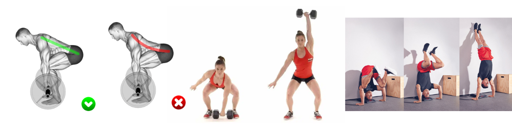 Deadlift - Olimpiai elemelés (balra), Kézisúlyzóval végzett szakítás (középen) és Handstand push up (jobbra)