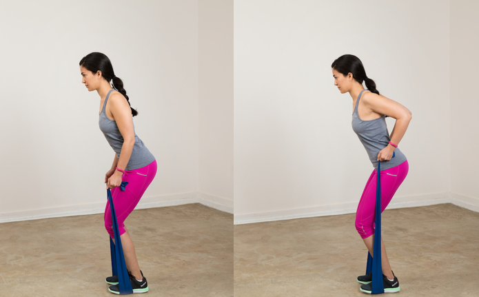 - A kiinduló helyzetben enyhén hajlítsd be a térdeidet és a szalag végeit a csípőd magasságától egy kicsit alacsonyabban tartsd.