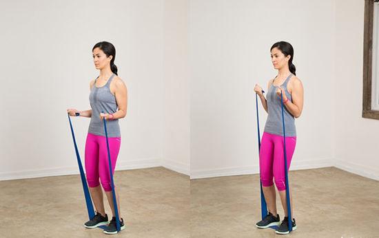 - Hajlítsd be a kezed miközben felfelé húzod a szalagot úgy, hogy közben a karod szorosan a tested mellett tartod.