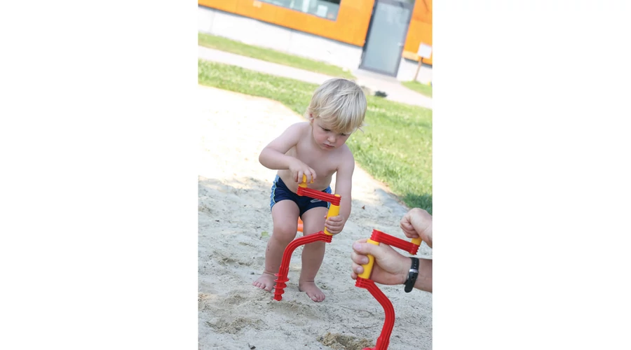 Robusztus műanyag homokfúró, amivel gyerekek könnyedén fúrhatnak lyukakat a homokban. |