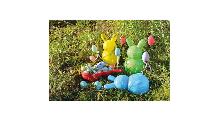 Ez a készlet 12 színes műanyag nyusziformát tartalmaz. Először húsvéti kosárként, tojás- és ajándékgyűjtésre használható, majd a tavaszi-nyári időszakban homokozó formaként újrahasznosítható. A formák könnyen tisztíthatók és biztonságosak a gyerekek számára.