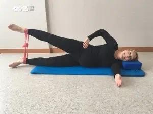Oldalt fekvésben, nyújtott lábakkal fekszünk. A bokák magasságában Thera-Band Gumiszalag hurkot rögzítünk. Fejünk alátámasztva, felül lévő kar csípőn, alul lévő kar a talajon nyújtva támaszkodik. Innen alsó hasizmunkat megfeszítjük, fenekünket megszorítjuk, lapockákat megfeszítjük, majd a felül lévő lábat elemeljük és lassan visszaengedjük.