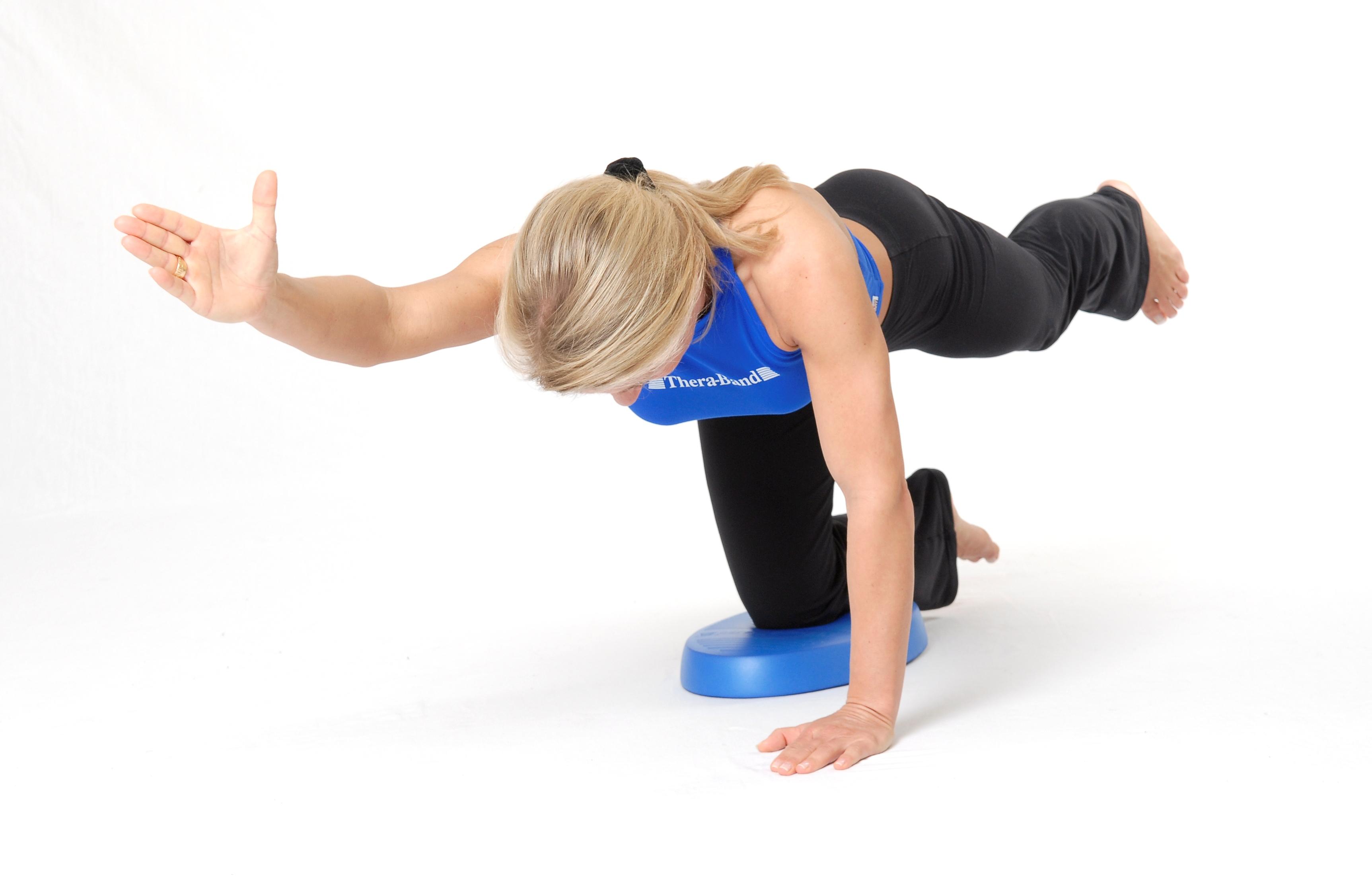 Négykézláb állásban elhelyezkedünk, térdünk alá helyezzük a TheraBand stabilitás trainer-t. Hasunkat, fenekünket megfeszítve emeljük ellentétes oldali kart, lábat nyújtva, majd lassan vissza leengedjük.