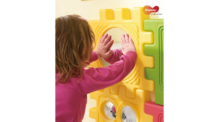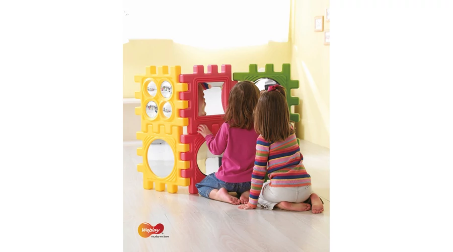 A We-Block készlet minden egyes eleme más-más tükörfelülettel rendelkezik: sík, homorú vagy domború. A készletben található tükrök sokféleképpen használhatók – kocka formában, fali tükörként vagy padlótükörként. A biztonsági akrilból készült felületek strapabírók és gyermekbarát megoldást kínálnak már 6 hónapos kortól, így a legkisebbek is biztonságosan fedezhetik fel az arcokat, a mimikákat és a saját tükörképüket. Az élmény egyszerre fejleszti az önismeretet, az észlelést és a szociális készségeket.