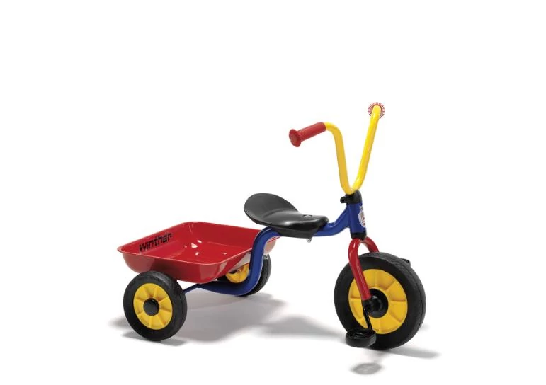 A MINI VIKING Krippendreirad mit Wanne a Winther márka ikonikus, bölcsődei és óvodai használatra tervezett fejlesztő járműve. Ez a különleges modell nemcsak egy stabil és biztonságos háromkerekű, hanem praktikus szállítóeszköz is, amelynek rögzített platója kiválóan alkalmas játékok, plüssök vagy akár homokozófelszerelés szállítására.